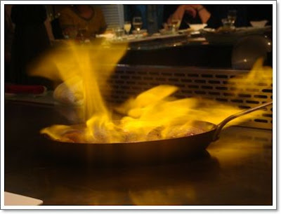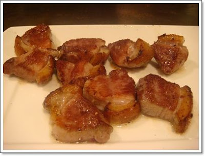 白蘭地鴨胸,煎至外皮酥脆後,淋上蘋果白蘭地酒,再點火燒烤