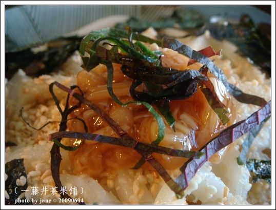 醬漬的金針菇,少許蔥花,海苔絲,白芝麻,佐上甘甜的昆布醬汁